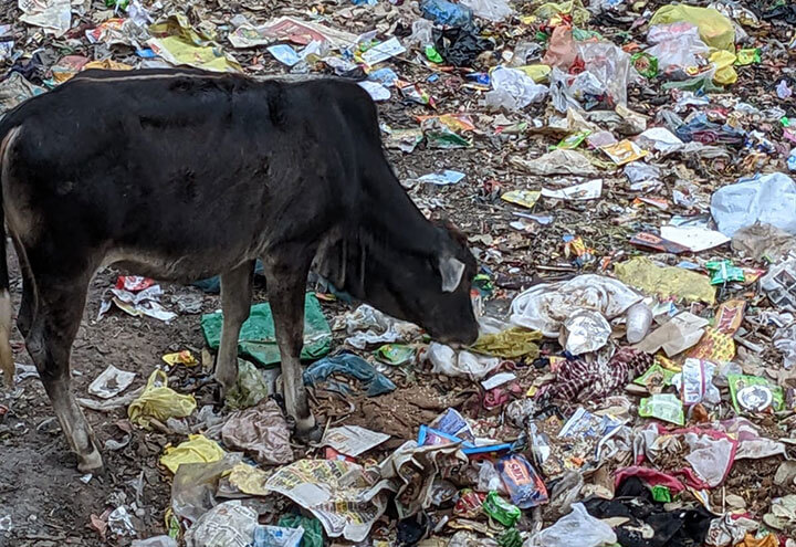 Many of the bustling Indian city streets are filled with trash such as used toys, disposable cutlery, overflowing bins and pollution clogging the air. The streets are cluttered and the air is thick with smog. Many street animals feed and choke to painful death. Disposable cutlery left after the small get together and social events forms major chunk of this plastic pollution